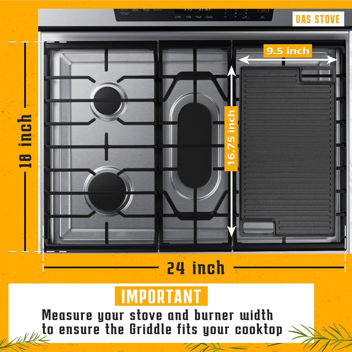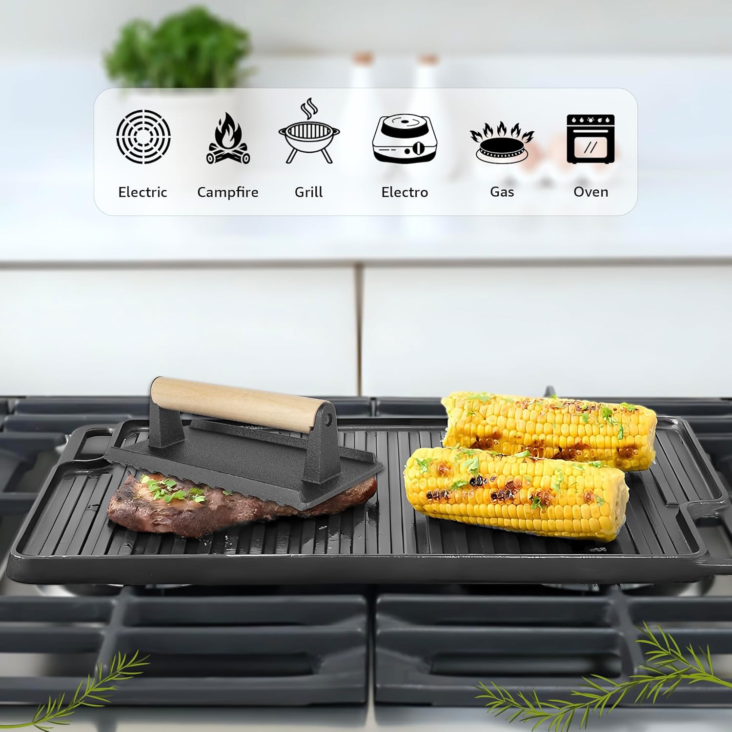 Crafted from high-quality cast iron, this set is pre-seasoned and non-stick, ensuring a hassle-free cooking experience every time. The reversible design allows you to use it as a grill or griddle, making it ideal for cooking a variety of dishes. With a generous size of 16.75" x 9.5", this set is perfect for use on gas stoves, grills, camping trips, and indoor and outdoor cooking.
