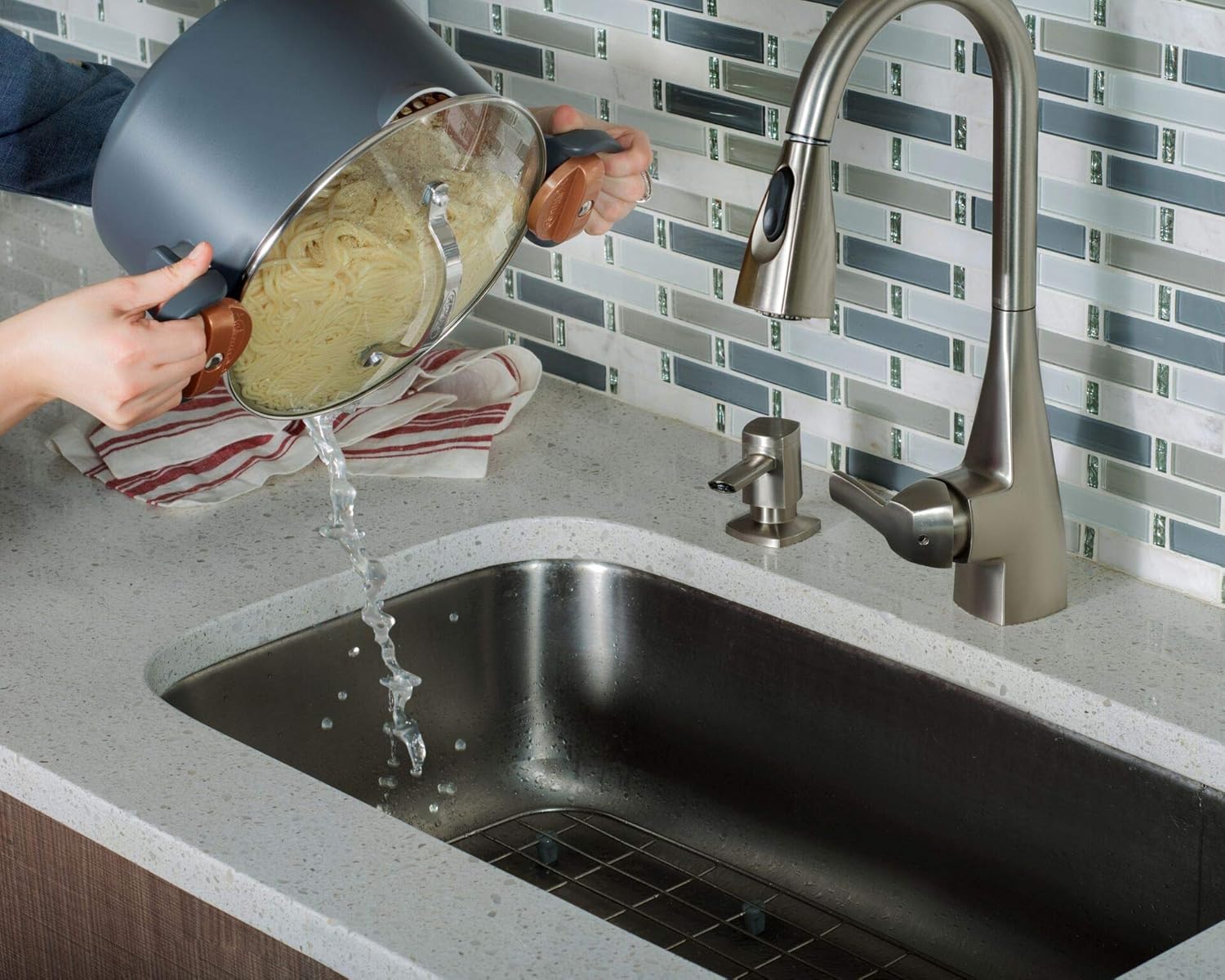 Introducing the Gotham Steel 5 Quart Stock Pot - the ultimate multipurpose pasta pot with a convenient strainer lid and twist and lock handles for easy handling. This versatile pot features a nonstick ceramic surface that makes for effortless cleanup, while the tempered glass lid allows you to monitor your cooking progress without releasing heat.
